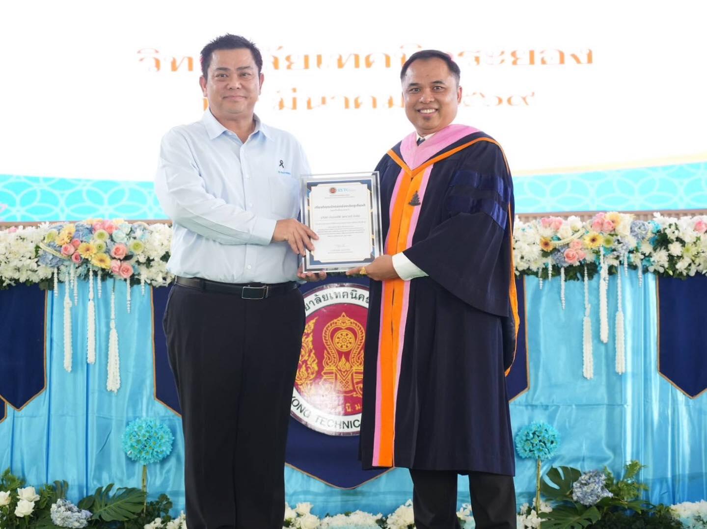 ภายในพิธีมอบประกาศนียบัตรแก่ผู้สำเร็จการศึกษา ประจำปีการศึกษา 2568 ณ วิทยาลัยเทคนิคระยอง นายอดิศร วังมูล ผู้อำนวยการสายงานการเงินและบริหารองค์กร บริษัท บีแอลซีพี เพาเวอร์ จำกัด เป็นตัวแทนบริษัทฯ ขึ้นรับมอบเกียรติบัตรเชิดชูเกียรติ จาก นายกิตติพงค์ อุตตะมะเวทิน ผู้อำนวยการวิทยาลัยเทคนิคระยอง ในฐานะที่โรงไฟฟ้าบีแอลซีพีเป็นอีกหน่วยงานที่ให้การสนับสนุนและมีส่วนร่วมอย่างสำคัญในการพัฒนาศักยภาพนักศึกษาอาชีวศึกษาให้มีสมรรถนะตรงตามความต้องการของตลาดแรงงาน